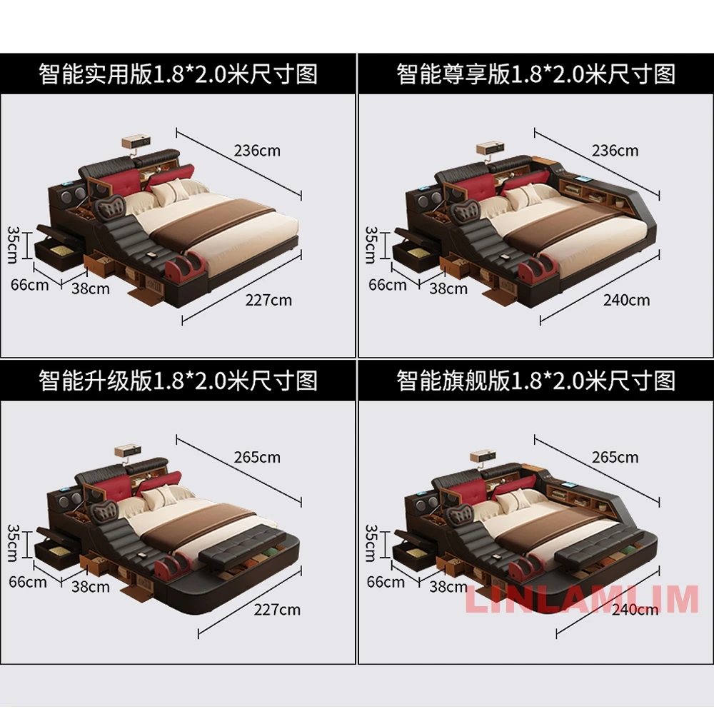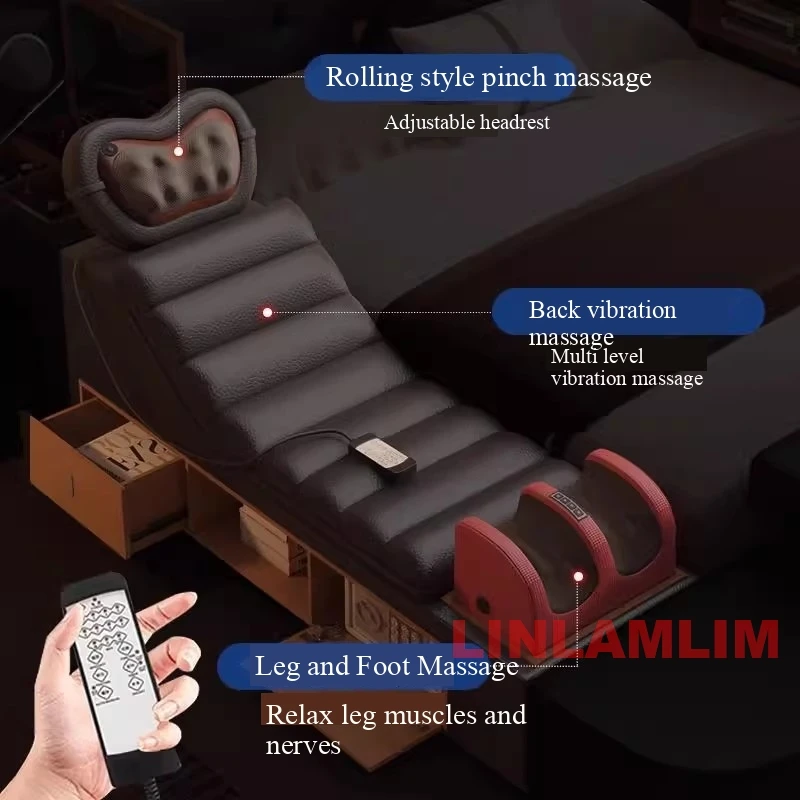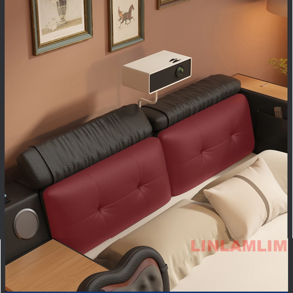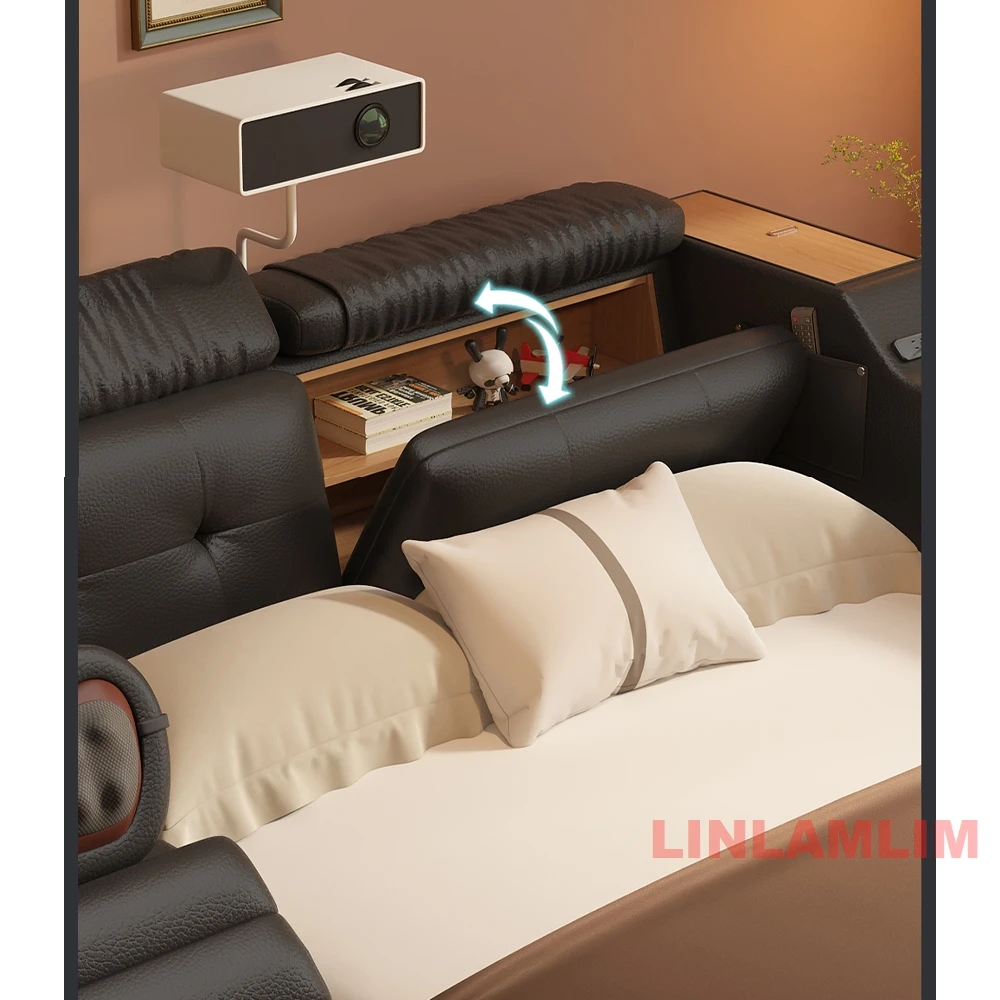 Luxury Smart Multifunctional Bed with Massage Chair, Projector, Storage, Bluetooth Speakers, Bookshelves & Recliner – Modern Upholstered King Size Bed with LED Light, USB Charging, and Entertainment System